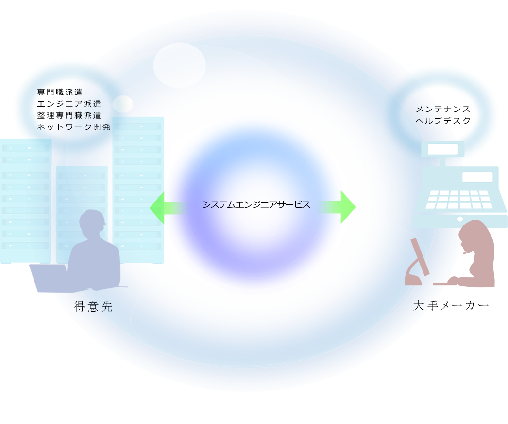 創業依頼、弊社は大手電気メーカー様にむけて、IT事業部のメンテナンス・オペレーション事業を展開してきました。また、事業を拡大する中でシステム・ネットワークに関するソリューションも提供しています。